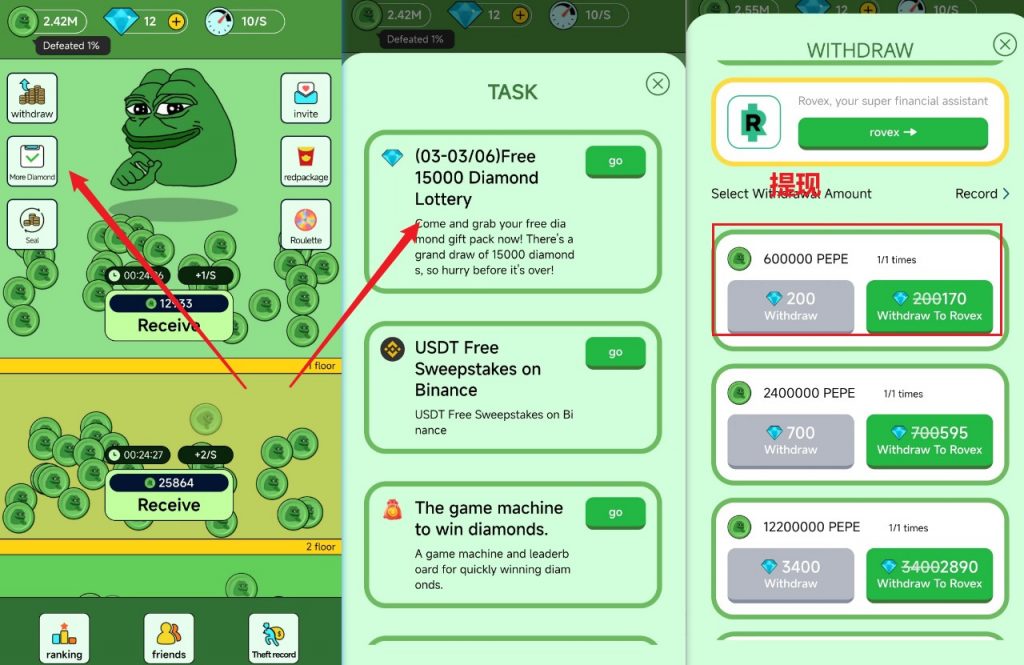 其实改项目的难点是在于如何获得更多的钻石,pepe币倒是好获取。除了通过推荐好友获取,更多的是来自于点击获取钻石的的第一个,每天其实可以点三次,每8个小时点一次,每次可以获得1——3个钻石,也就是你不需要要求好友也可以获得很多钻石。