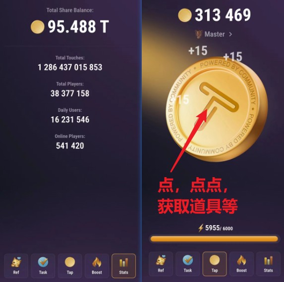 TG上面我要推荐的第一个项目是:tap项目,只需要在上面点点,适当的用点点获得的币升级,以便获取更多的币,都是比较简单的,不教了,你玩两把就会了。