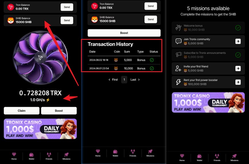 第六个项目:tronix项目,打开链接直接获得15000shib,还有trx币,到达一定量后,可以直接提取,这个小项目其实也相当于手机上的挂机项目,免费送的不要白不要。