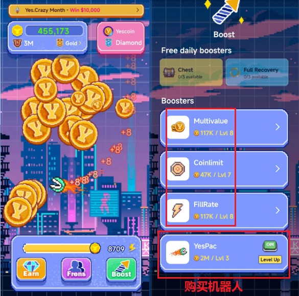 第七个项目:yescoin,这个项目也是一个空投项目,之前已经空投过3万美金,通过自己刷到的币购买机器人帮你收币,然后也可以变成一个挂机项目。